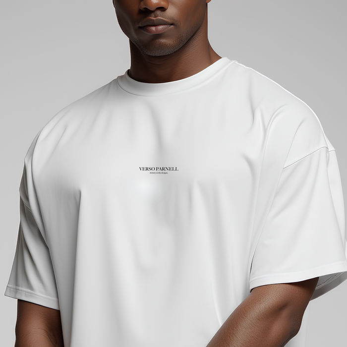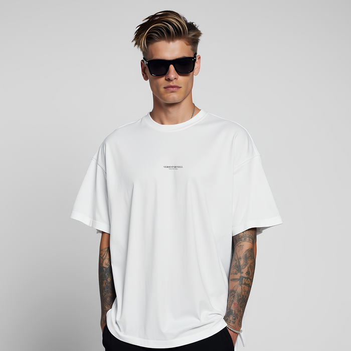 The Signature White Oversize T-Shirt with Back Print is designed for those who want simplicity in the front and boldness at the back. As a result, it offers the best of minimalism and expression in one. This premium cotton tee features a centered Verso Parnell logo and a bold back print, combining structure and comfort. The clean silhouette makes it ideal for both casual and styled occasions.