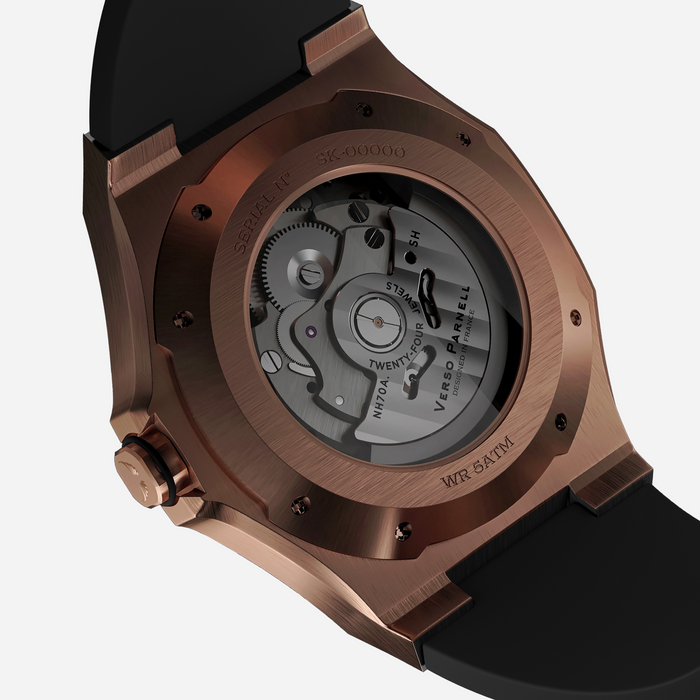 This rose gold skeleton watch, powered by the NH70A Seiko automatic movement with 24 jewels, features a finely detailed crown that adds a touch of sophistication. The openwork design showcases the craftsmanship and precision that define timeless elegance.