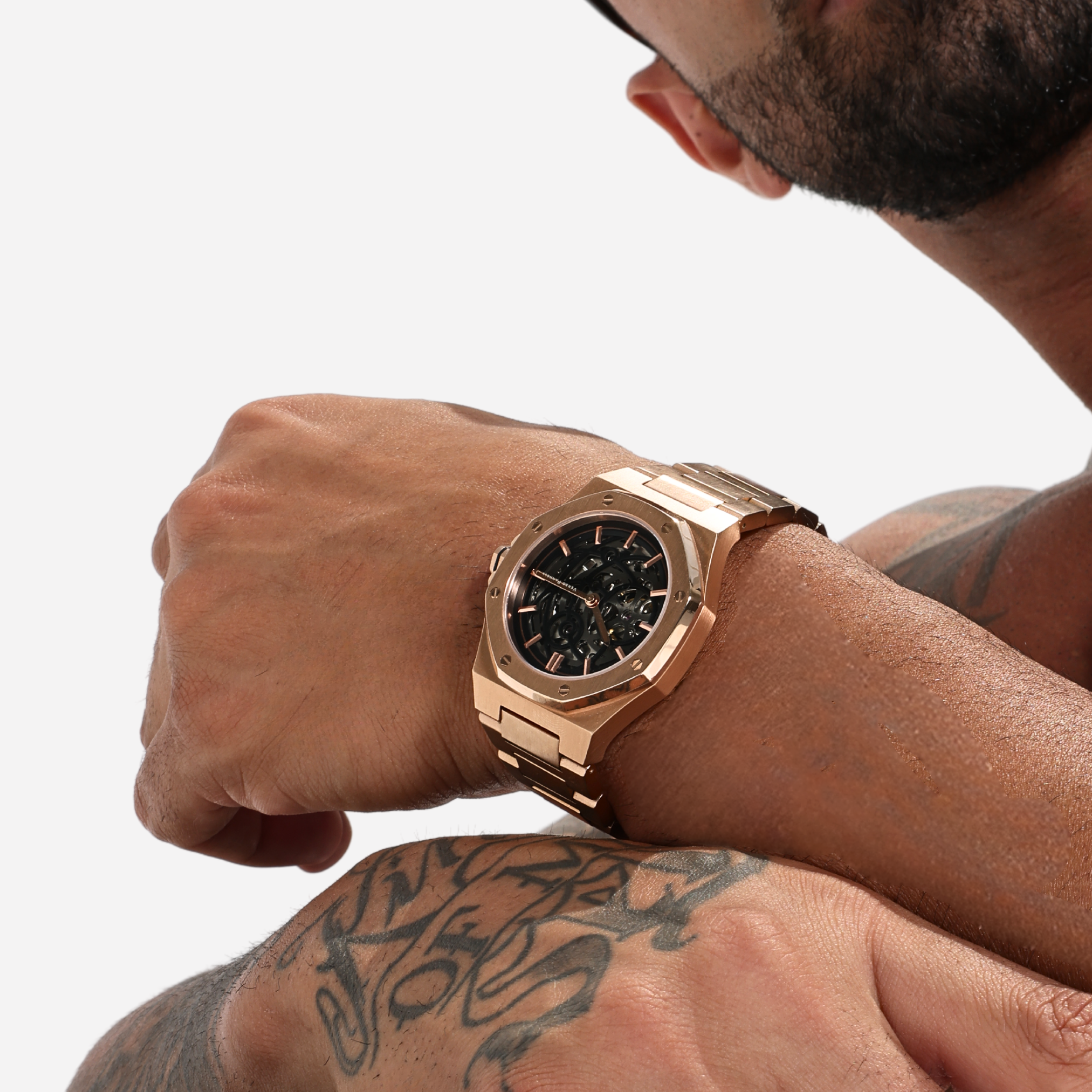 Crafted with precision and adorned in luxurious rose gold. The intricate openwork design of our skeleton watch reveals the heart of the timepiece, blending engineering marvel with beauty. Each detail is a celebration of elegance. With its bold yet refined presence, this masterpiece brings unparalleled style to every moment.
